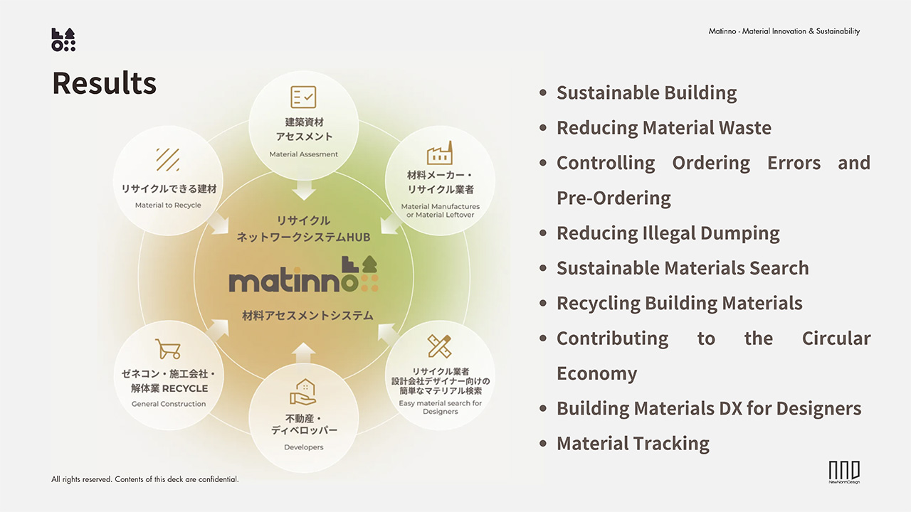 NND is helping to reduce CO2 emissions throughout the lifecycles of buildings, from design, construction, and renovation through to demolition, by promoting the sustainable use of construction materials. It has established "matinno", a software service (SaaS) platform to prevent wastage through the sharing of information about surplus construction materials from manufacturing processes and construction sites, so that materials that would otherwise have been scrapped can be recycled and reused. NND contributes to the reduction of CO2 emissions by promoting the recycling and reuse of surplus construction materials leftover through "matinno".