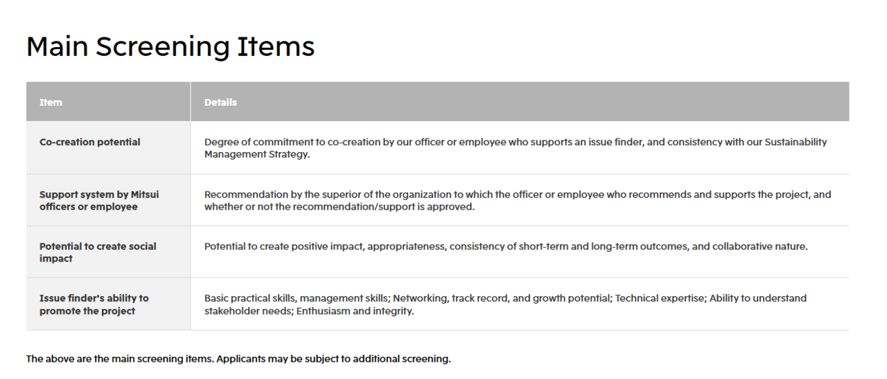 Sasaki: It's a recommendation-based system. Officers and employees can nominate an Issue Finder, or we may receive external applications through our website or other channels. First, we conduct a matching process, followed by an application, internal review, and final approval.